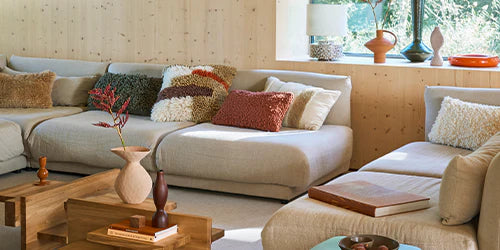 Denk in lagen. Combineer een vloerkleed met een groep sierkussens, een plaid, en een decoratief object zoals een kaarshouder of beeld. Verschillende texturen – zoals wol, keramiek, glas of hout – zorgen voor diepte en warmte in je ruimte.