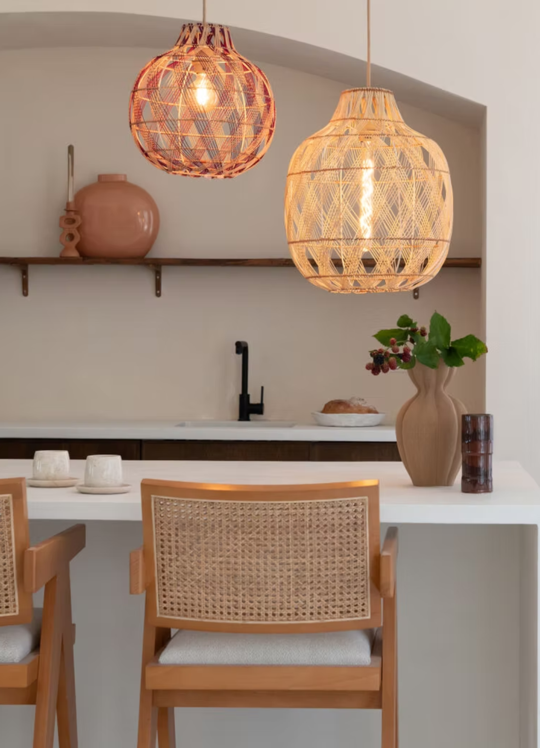 - Materialen zoals rotan, bamboe, hout, linnen, katoen, wol, keramiek en macramé