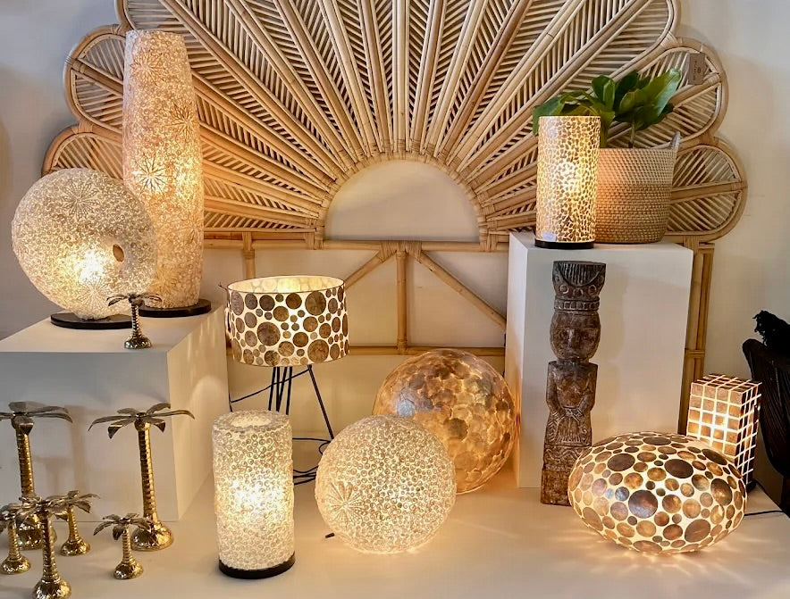 Schelpenlampen brengen rust, warmte en een unieke glans in je interieur. Gemaakt van natuurlijke materialen zoals capiz- of parelmoerschelp, zorgen deze lampen voor een sfeervol lichteffect en een verfijnde uitstraling. Of je nu gaat voor een opvallende hanglamp, een subtiele tafellamp of een elegant wandmodel: schelpenlampen zijn echte eyecatchers die passen in uiteenlopende woonstijlen – van bohemian en coastal tot hotel chique. Elke lamp is met zorg gemaakt en straalt ambacht en karakter uit. Geef je interieur een zachte, natuurlijke touch en laat je betoveren door de magie van schelpverlichting.
