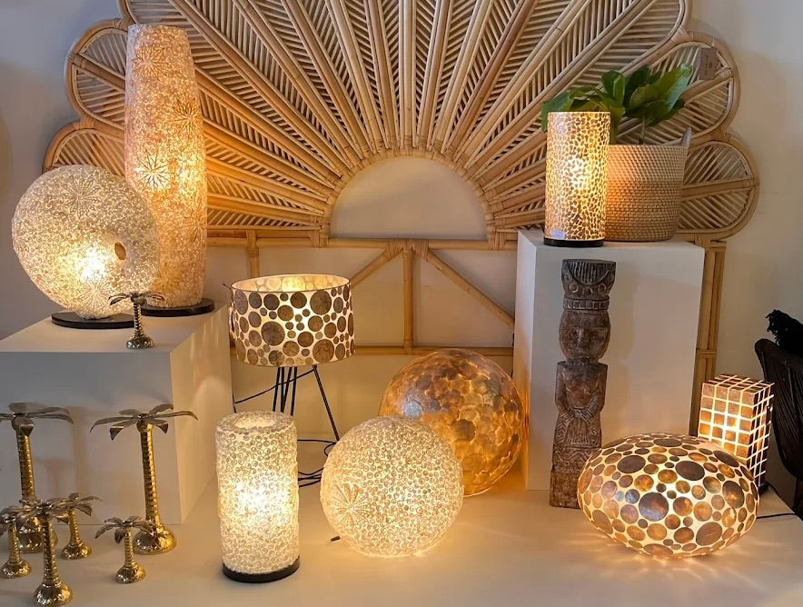 - Materialen zoals hout (teakhout, suarhout), rotan, bamboe, linnen, katoen, natuursteen, keramiek en schelpen verwerkt in decoratieve verlichting en accessoires
