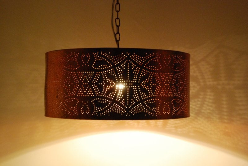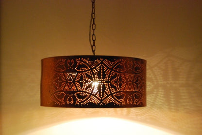 Leuke koper kleurige oosterse hanglamp die uitermate geschikt is voor een gang, wc, washok of kinderkamer. Houd U van minimale aanwezigheid van Uw verlichting dan kunnen ze per 2 of 3 ook zeer leuk zijn boven een tafel of kookeiland. Door zijn met de hand bewerkte gaatjes frame brengt deze lamp leuke schaduwtekeningen met zich mee maar dit is indien U dit wenst want is afhankelijk van welke lamp U er in draait. Het metaal van deze lampen is vaak messing of koper en omdat dit een makkelijk vormbaar ijzer soorten zijn wordt dit vaak ingezet in de oosterse/oriëntaalse pendels. Hierdoor kunnen mooi gevormde hanglampen vervaardigd worden rijkelijk bewerkt met sfeervolle gaten patronen. Messing/koper zijn meer goud/rood van finish en daarom worden de lampen vaak nog met de hand beschildert of beplakt.