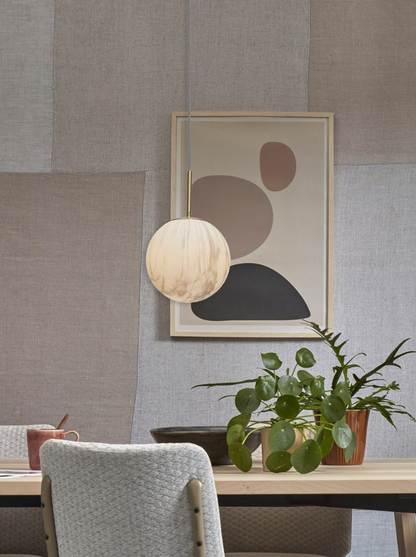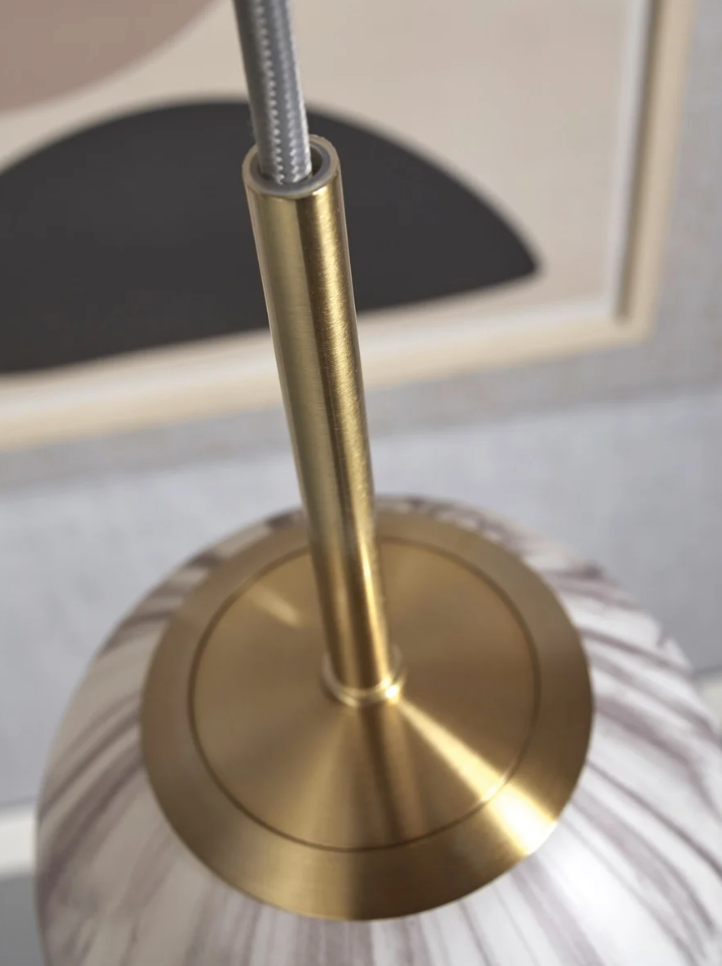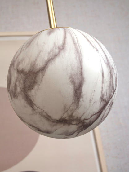 De stijlvolle Carrara hanglamp, met zijn subtiele verlichting, voegt een vleugje elegantie toe aan je kamer. Gemaakt van metaal met een matte gouden afwerking, heeft deze lamp een witte glazen bol met marmeren print en een gouden detail op het snoer. Ø 22 cm, geschikt voor E14 lamp.
