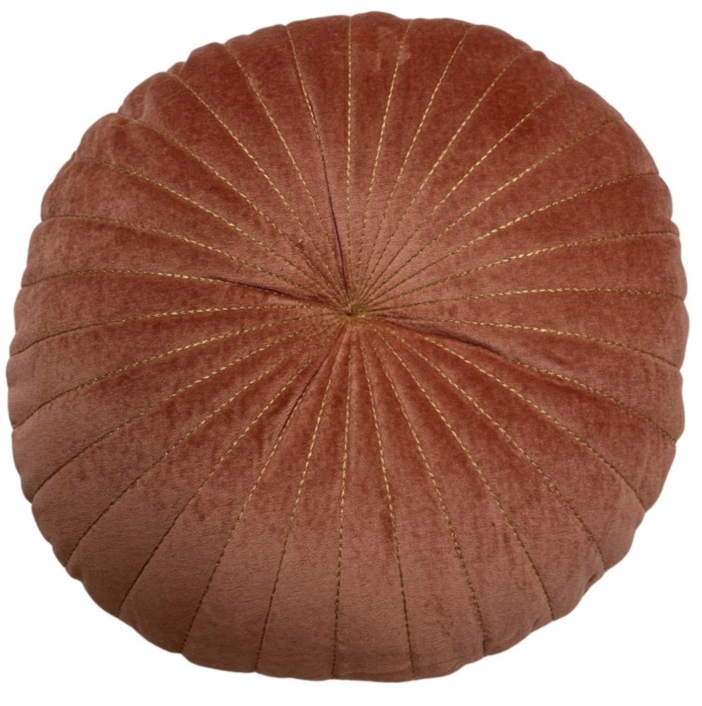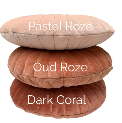 Deze klassieke en luxueuze ronde kussens hebben een diameter van 40 en 50 centimeter en zijn gemaakt van velours, een zijdezacht materiaal wat heerlijk aanvoelt en zeer comfortabel is. De kussens zijn versierd met een design van gouden stiksel van lijnen die naar het centrum van het kussen lopen. Ook de afwerking van deze mooie kussens van hoge kwaliteit en uit zich onder andere in een blinde ritssluiting. De kussens zijn mooi met elkaar te combineren alsmede met de grotere kussens uit dezelfde collectie.