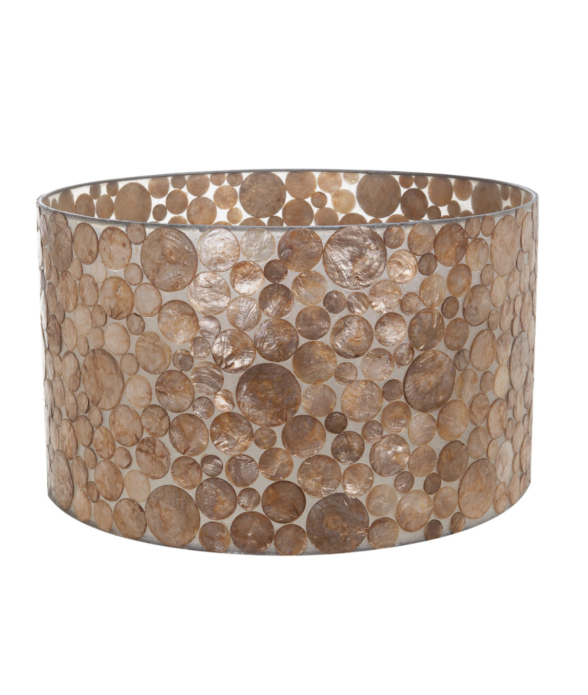 Zeer speciale kap om sfeer te brengen in uw interieur. Let op! het gaat bij dit product om alleen de kap, zonder pendel! De afmetingen van deze lamp bedragen een hoogte van 32 centimeter en een diameter van 55 centimeter voor de grote versie en een hoogte van 20 centimeter bij een diameter van 30 centimeter voor de kleinere. De kappen bestaan uit een cilindervormige fiberglas mal in goudbruine kleur. Op deze cilinder zijn platte, lichtdoorlatende Capiz schelpen bevestigd. Deze schelpen worden al sinds eeuwen gebruikt voor vensters, lampen en andere decoratieve doeleinden en verspreiden een prachtig licht.