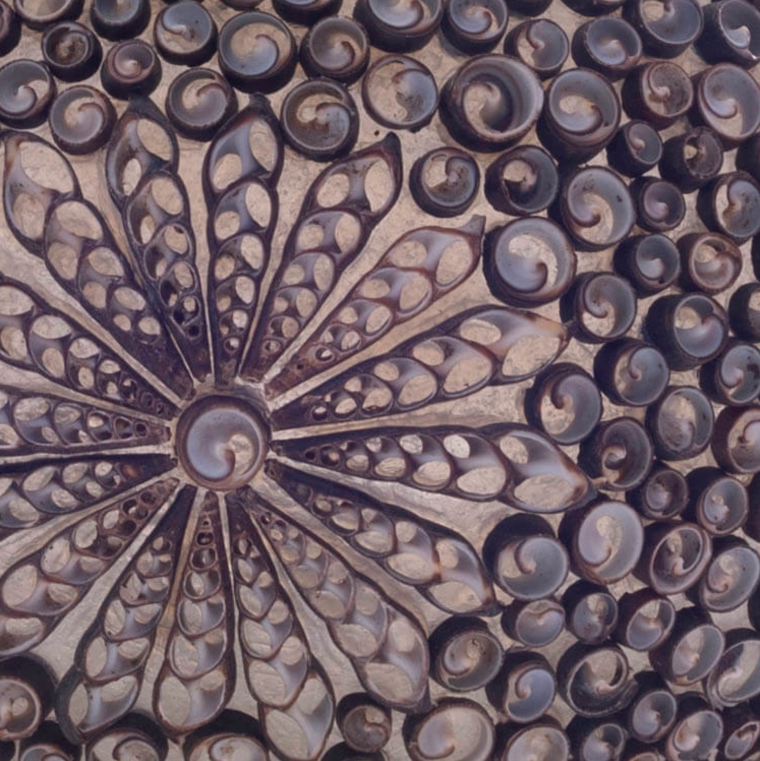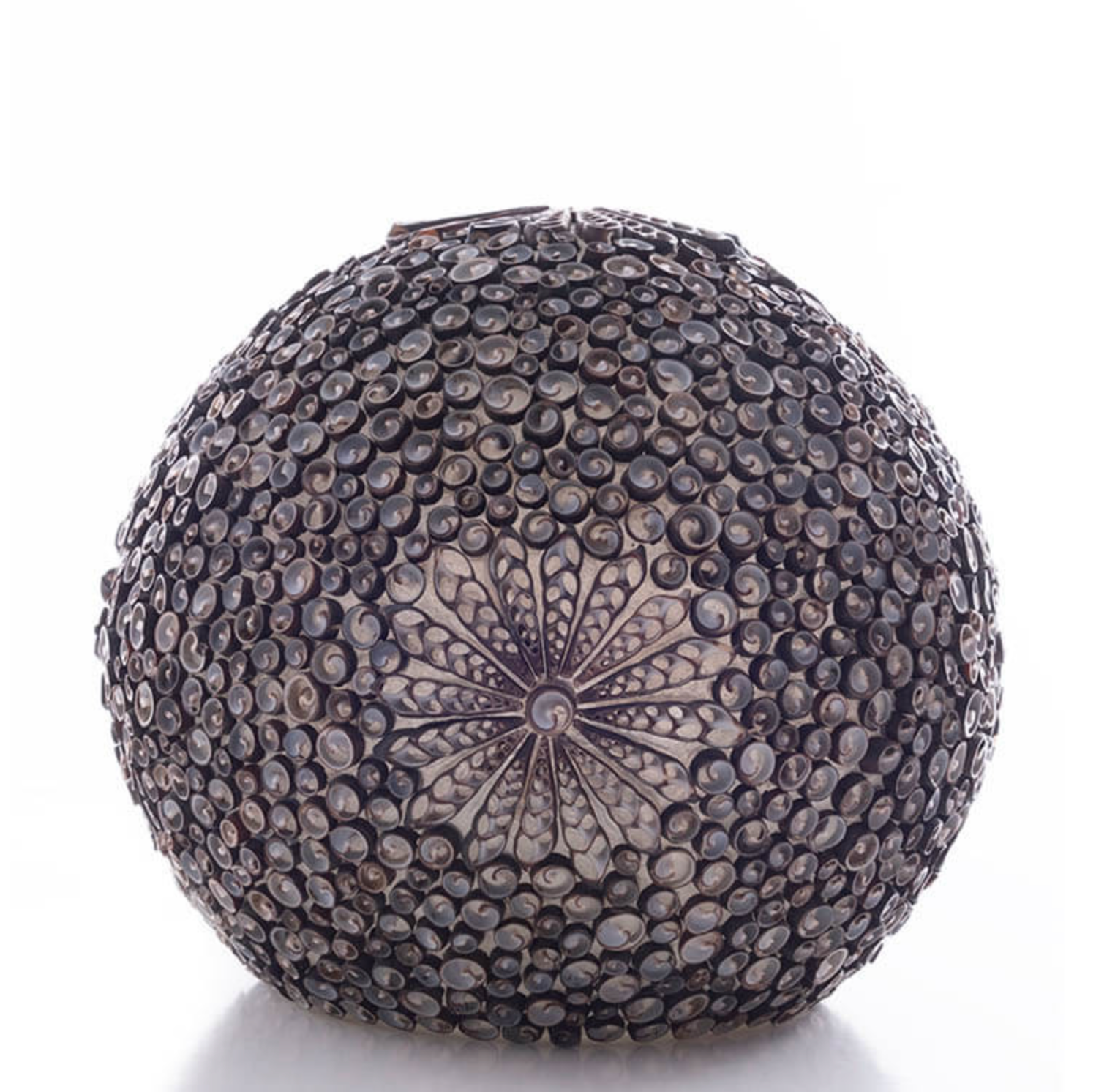 Inspirerende, bolvormige tafellamp. Deze mooie lamp heeft een diameter van 30 centimeter en is aan de onderkant afgevlakt waardoor hij een basis heeft om op te staan. De bolvorm van deze sfeervolle lamp zorgt ervoor dat het licht op een mooie egale en rustgevende manier door uw woning wordt verspreid. De lamp bestaat uit een bolvormige fiberglas mal in een witte kleur. Op deze cilinder zijn gesneden schelpen bevestigd, die samengebracht zijn in prachtige decoratieve patronen. De patronen zijn met de hand gemaakt dus de motieven kunnen varieeren.