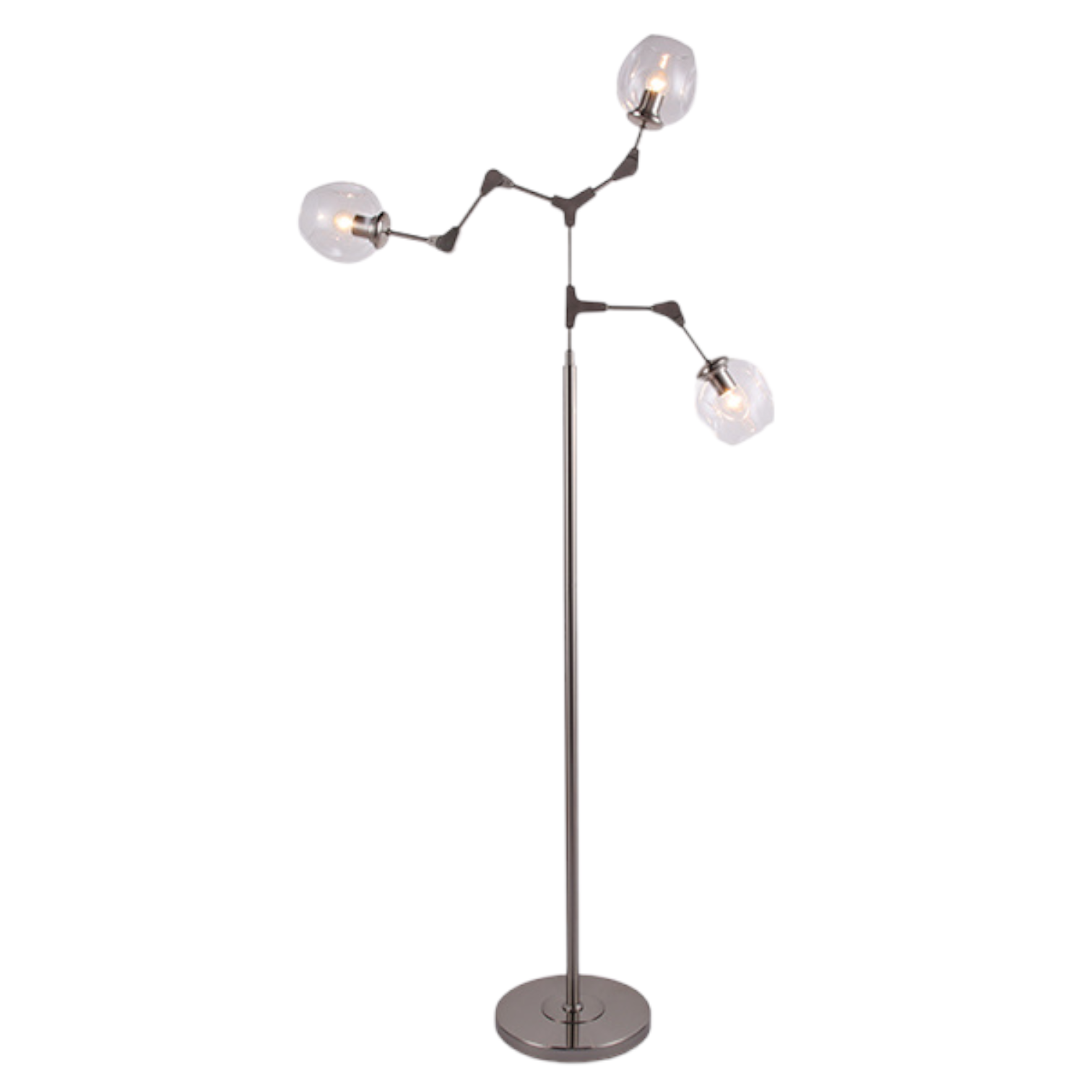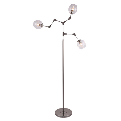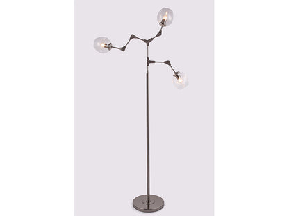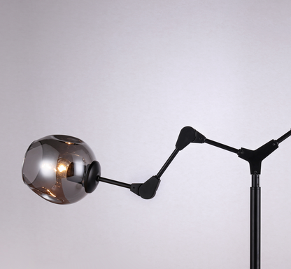 Mooie minimalistische design vloerlamp in de Atoom serie. Deze gave lamp is gemaakt van verscheidene armen waarvan u middels een ingenieuze klem koppeling systeem zelf de stand kunt bepalen. De onderste arm zou u zo kunnen verstellen dat het een leeslamp wordt. Deze gave vloerlamp is voorzien van 3 glazen bollen waarvan u zelf de kleur kunt bepalen. Beschikbare kleuren zijn Amber, Grijs en Helder glas.