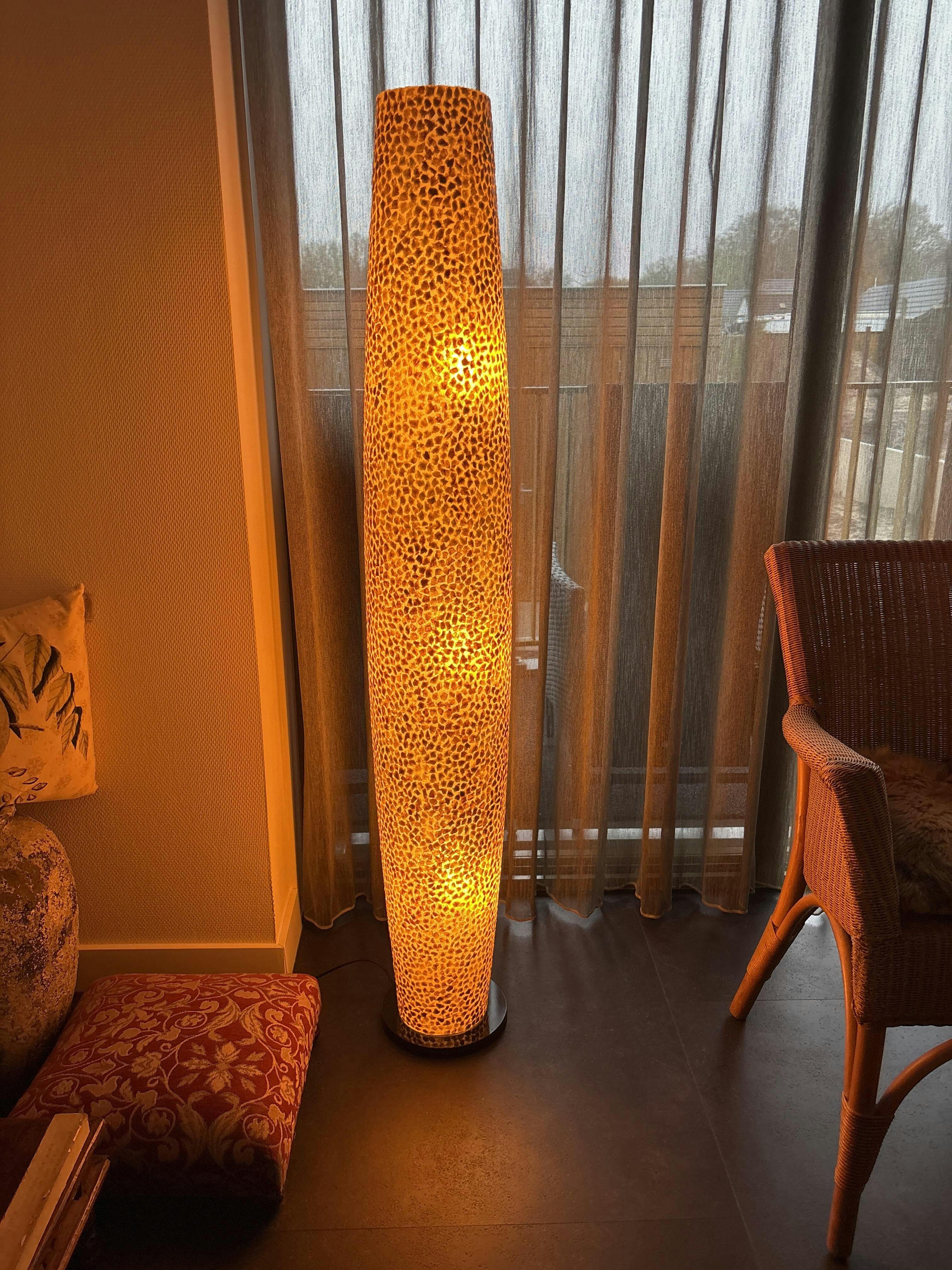 De hoogtes van deze speciale lampen zijn van klein naar groot respectievelijk 70, 100, 150 en 200 centimeter. De goudbruine fiberglas zuil is bekleed met gebroken goudkleurige Capiz schelpen, die in deze constellatie doen denken aan een luipaardenhuid. Een beestachtig mooie lamp die, doordat deze schelpen lichtdoorlatend zijn, het licht op een warme en sfeervolle manier filteren. De kleinste lamp heeft een enkel lichtpunt, de middelste twee en de grotere allebei drie lichtpunten.