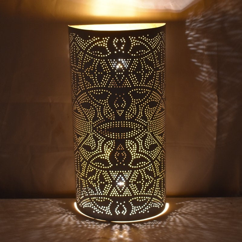Betoverende filigrain wandverlichting met een vrolijke gaten design. Breng een stukje kunst in Uw kamer met deze leuke gaatjes wand armatuur van dePauwWonen die bij de juiste lamp een geweldige schaduwpatroon geeft op Uw muur waardoor de avonden thuis sfeer en gezelligheid met zich meebrengen. Deze oosterse gaatjes lampen zijn de creatie van vaklieden die iedere lamp nog middels handwerk maken en boren. Oosterse filigrain lampen zijn verkrijgbaar in een ruime keuze van vormen, kleuren en gaten patronen en elke lamp is exceptioneel en een kunstvoorwerp in uw woning. Het ijzer van deze lampen is vaak messing of koper en doordat dit een zachte metaal soorten zijn wordt dit vaak ingezet in de oosterse/oriëntaalse items. Hierdoor kunnen sierlijk gevormde lampen vervaardigd worden overvloedig bewerkt met mooie gaten patronen. Messing/koper zijn meer goud/rood van kleur en daarom worden de lampen vaak nog met de hand beschildert of beplakt. Deze specifieke wandlamp is beplakt met hele dunnen stroken imitatie blad goud waardoor de lampen een vintage uitstraling krijgen.