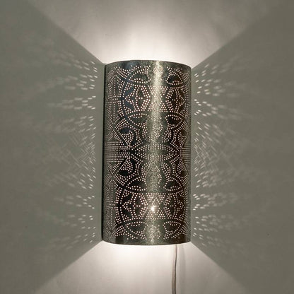 Betoverende oosterse wandlamp met een vrolijke gaten patroon. Breng oosterse sferen in Uw woning met deze fantastische gaatjes wandlamp die schitterende schaduweffecten zal geven op uw muur waardoor de avonden thuis een en al gezelligheid worden. Deze oosterse filigrain wandlampen zijn het product van vaklieden die iedere lamp frame nog middels handwerk maken. Oosterse lampen zijn verkrijgbaar in een ruime keuze van vormen, kleuren en gaten patronen en elke lamp is exceptioneel en een kunstwerkje in de leefruimte. Het metaal van deze lampen is vaak messing of koper en doordat dit een makkelijk vormbaar ijzer soorten zijn wordt dit vaak toegepast in de oosterse/oriëntaalse lampen series. Hierdoor kunnen stijlvol gevormde lampen gemaakt worden overvloedig bewerkt met leuke gaten patronen. Messing/koper zijn meer goud/rood van uiterlijk en daarom worden de lampen vaak nog met de hand beschildert of beplakt zo dus ook deze wandlamp die beplakt is met hele dunne stroken bladzilver waardoor de lamp een vintage uitstraling krijgt.